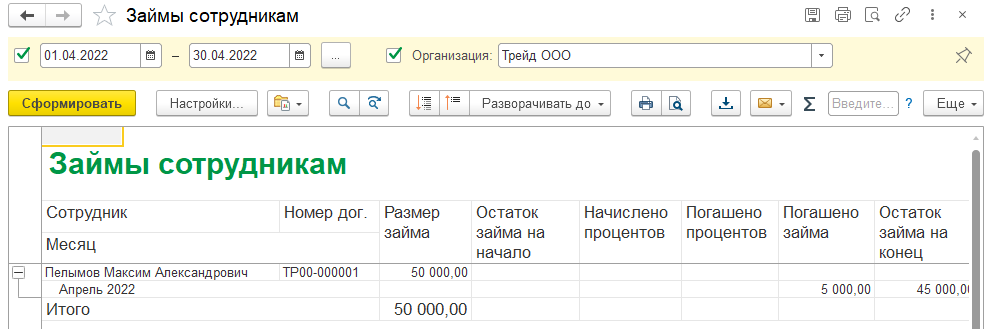 В разделе "Зарплата / Отчеты по зарплате" можно сформировать отчет "Займы сотрудникам". Данный отчет позволяет проанализировать удержания в счет погашения займов сотрудников и остатки по займам на конец выбранного периода.