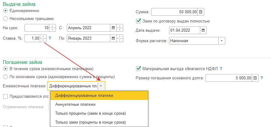 Погашение займов может осуществляться удержанием из заработной платы при окончательном расчете за месяц в документе "Начисление зарплаты и взносов. Здесь же производится расчет процентов по займу, материальной выгоды и НДФЛ с нее. При необходимости погашение займа можно зарегистрировать отдельным документом.