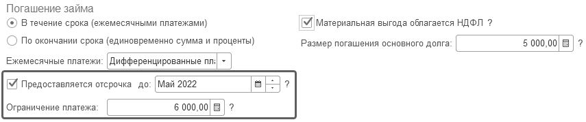 По займу может предоставляться отсрочка – в этом случае следует указать, с какого месяца начнется погашение займа, а также ограничение платежа после отсрочки.
