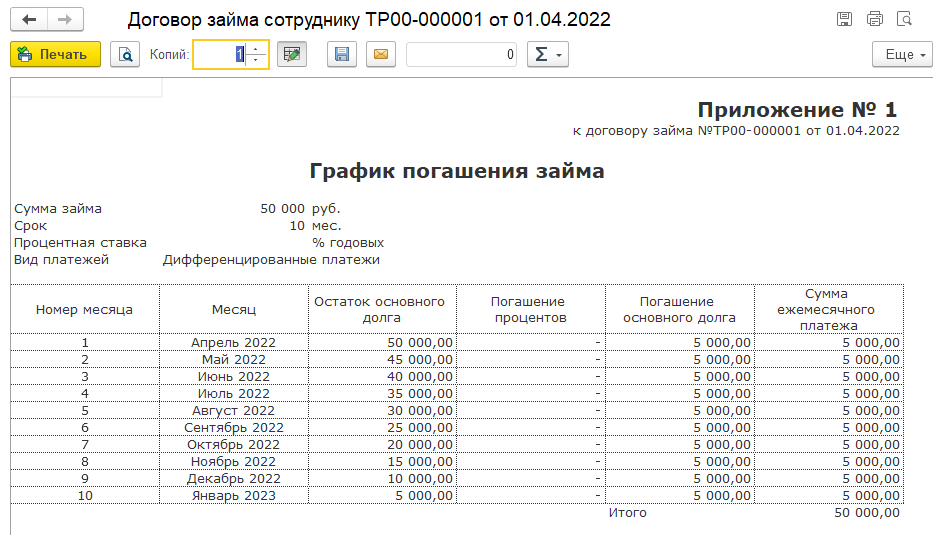 Условия выдачи займов указываются в договоре займа. Займы могут быть беспроцентные и процентные с различными условиями погашения. При необходимости в дальнейшем можно изменить условия займа отдельным документом на изменение условий займа.