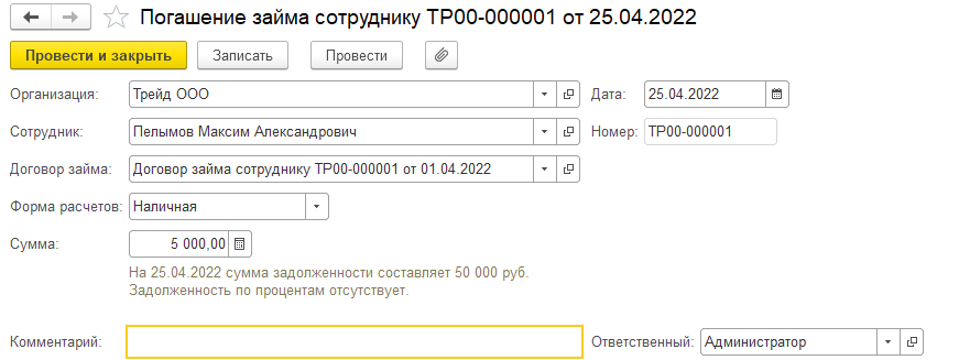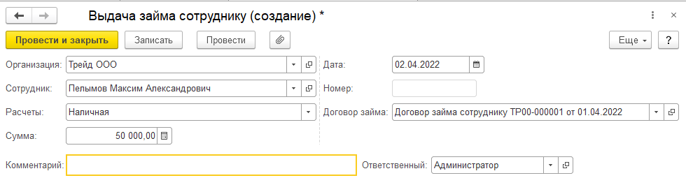 Документ может вводиться на основании договора займа либо на основании карточки сотрудника.