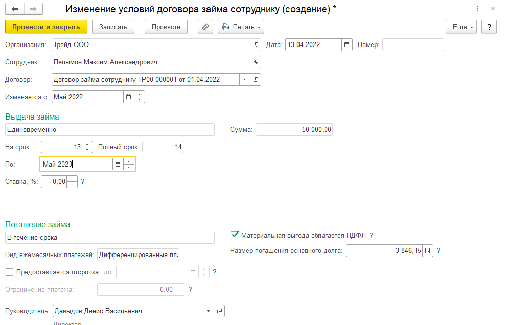 Если в течение срока действия договора займа, его условия изменяются, следует ввести документ "Изменение условий займа".
