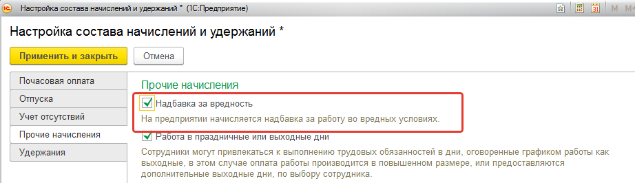 - Настройка/ Расчет зарплаты / Настройка состава начислений и удержаний / Прочие начисления – установить флаг "Надбавка за вредность". Данная настройка обеспечивает расчет надбавки и отпуска за вредность.