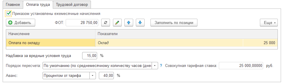 Надбавка за вредность учитывается по штатному расписанию и может быть скорректирована вручную.