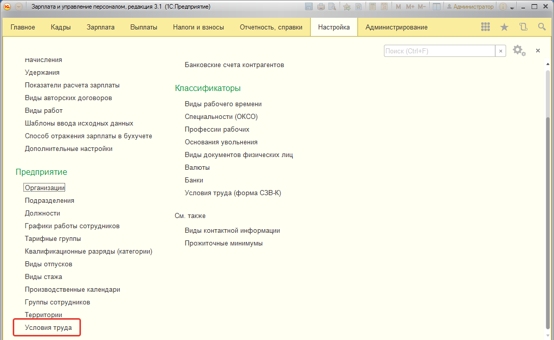 5.2. Специфика условий труда описывается в справочнике "Условия труда". Он вызывается из раздела "Настройка".