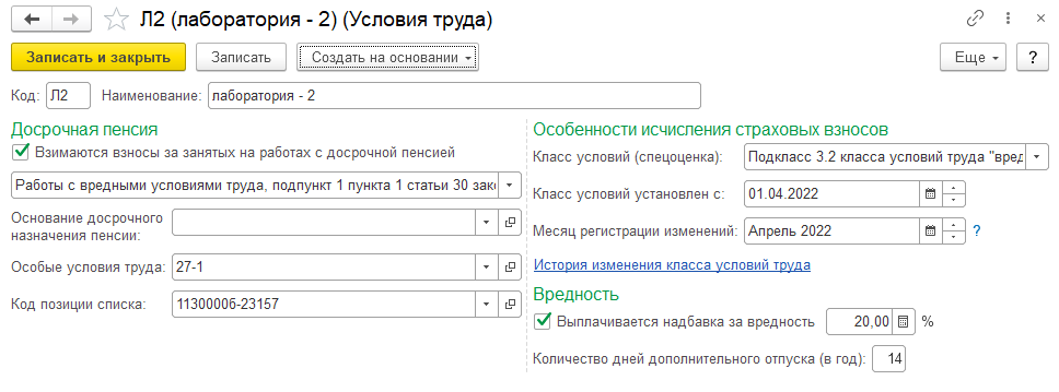 2. В справочнике "Должности" те должности, которые предполагают работу в особых условиях, создаются отдельно.