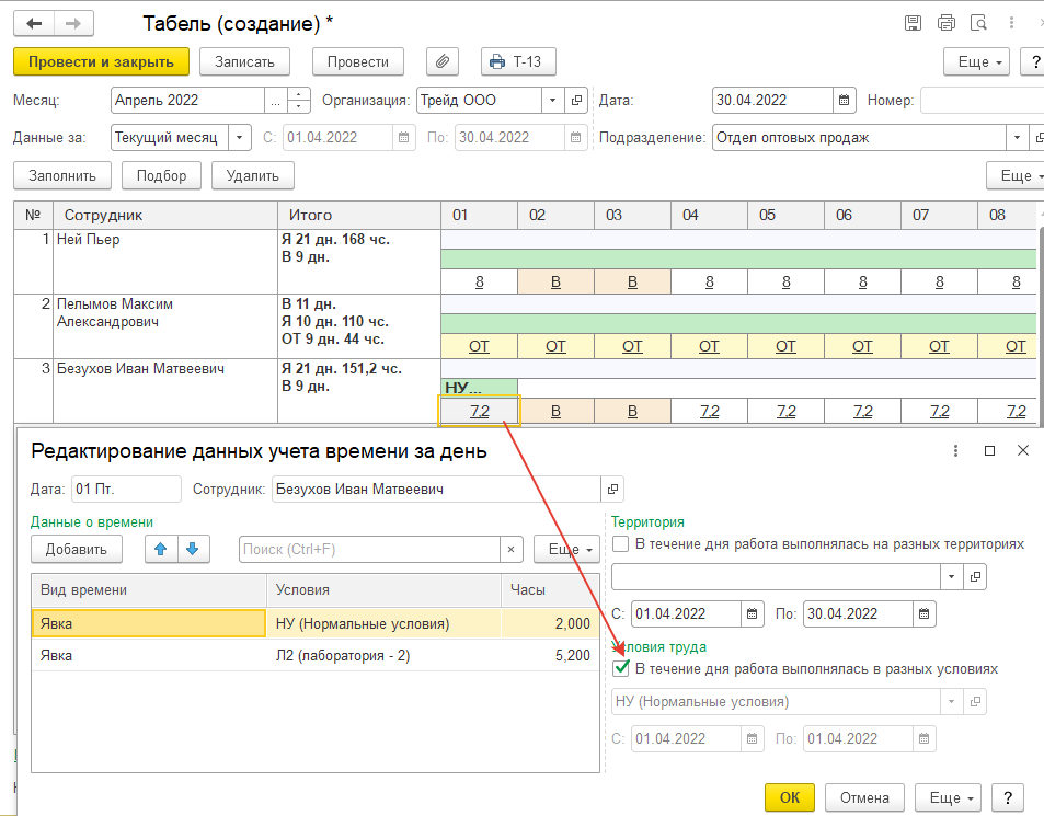 Редактирование времени в табеле производится в отдельной форме, которая открывается по щелчку в ячейке. При этом имеется возможность регистрировать работу на разных территориях или в разных условиях работ в течение одного дня.