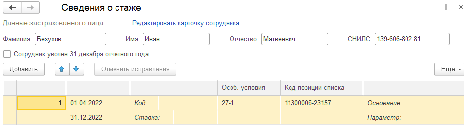 Он заполняется подбором из списков-классификаторов (по аналогии с кадровыми классификаторами). Данные коды будут использоваться при формировании сведений о стаже для ПФР. Например, требуется код 1130000б-23157, Лаборанты.