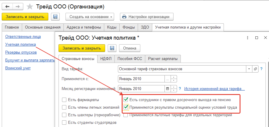 - Настройка / Организации / Учетная политика – установить флаг "Есть сотрудники с правом досрочного выхода на пенсию". При необходимости можно указать особенности расчета взносов: спецоценка, летчики, шахтеры и т.п. Эта настройка обеспечивает возможность работы с дополнительными взносами в Пенсионный фонд, а также со льготным стажем для пенсии.