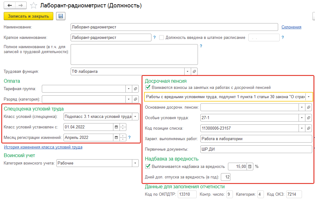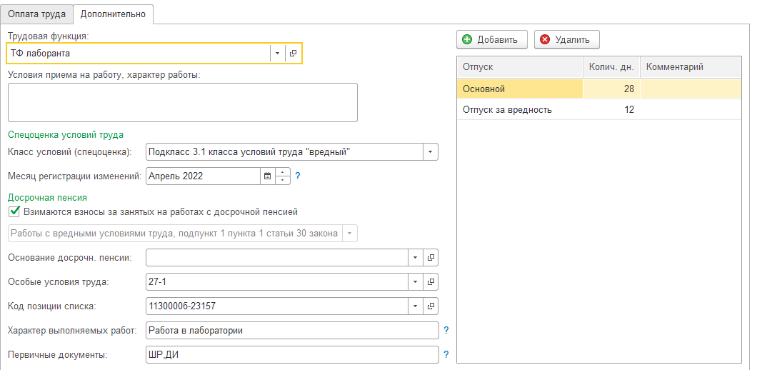 Особенности "вредной" должности для позиции отражаются на закладке "Дополнительно".