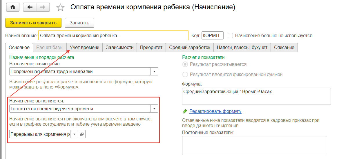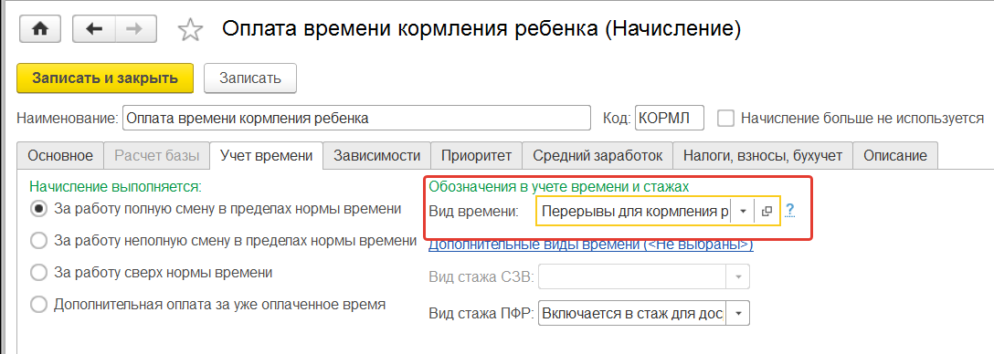 Это означает, что оплата таких перерывов для кормления будет рассчитана только при окончательном расчете зарплаты документом "Начисление зарплаты и взносов" и только в том случае, если для сотрудника каким-либо способом будет зарегистрировано время "Перерывы для кормления ребенка" (например, в табеле будет указана буква КР).