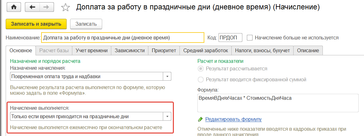 Только если время приходится на праздничные дни – такое начисление будет выполняться при окончательном расчете зарплаты за месяц в том случае, если в месяце у сотрудника есть рабочие дни, выпавшие на праздники. Праздники определяются в соответствии с производственным календарем. Этот способ выполнения наиболее специфичный из всех и, как правило, используется для ввода автоматической доплаты за праздники сменщикам.