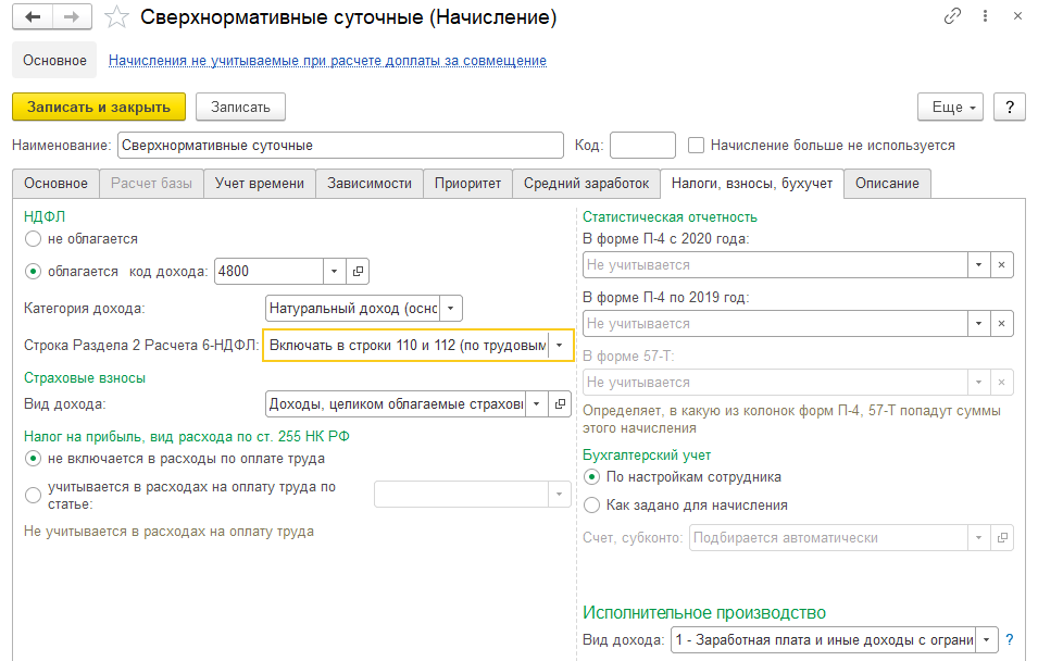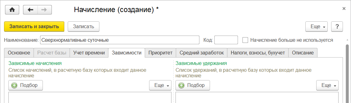 Остальные настройки оставим по умолчанию. Запишем и закроем начисление.