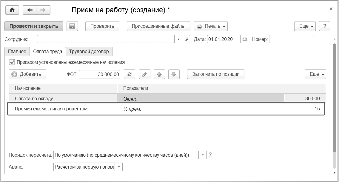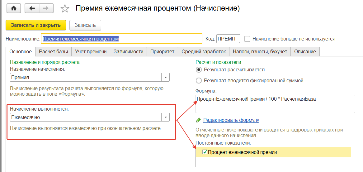 1. Ежемесячно – такое начисление можно назначить сотруднику как плановое (постоянное) в документах изменения оплаты труда, и оно будет автоматически выполняться (заполняться и рассчитываться) при окончательном расчете зарплаты документом "Начисление зарплаты и взносов". При этом при настройке можно отметить те постоянные показатели, значения которых будут запрашиваться при назначении начисления для сотрудника. Пример. Если премия сотруднику должна рассчитываться от оклада текущего месяца, то скорее всего, она будет настроена со способом выполнения – ежемесячно.