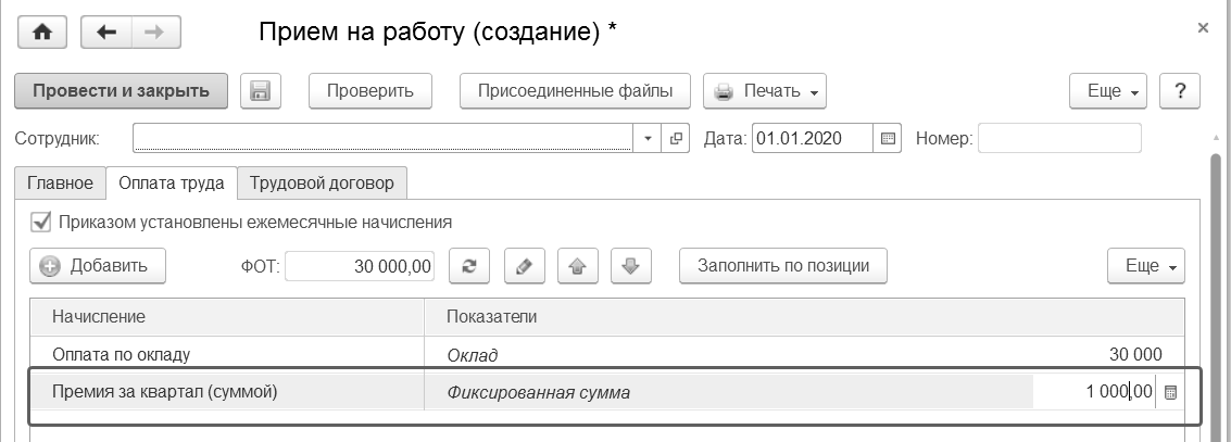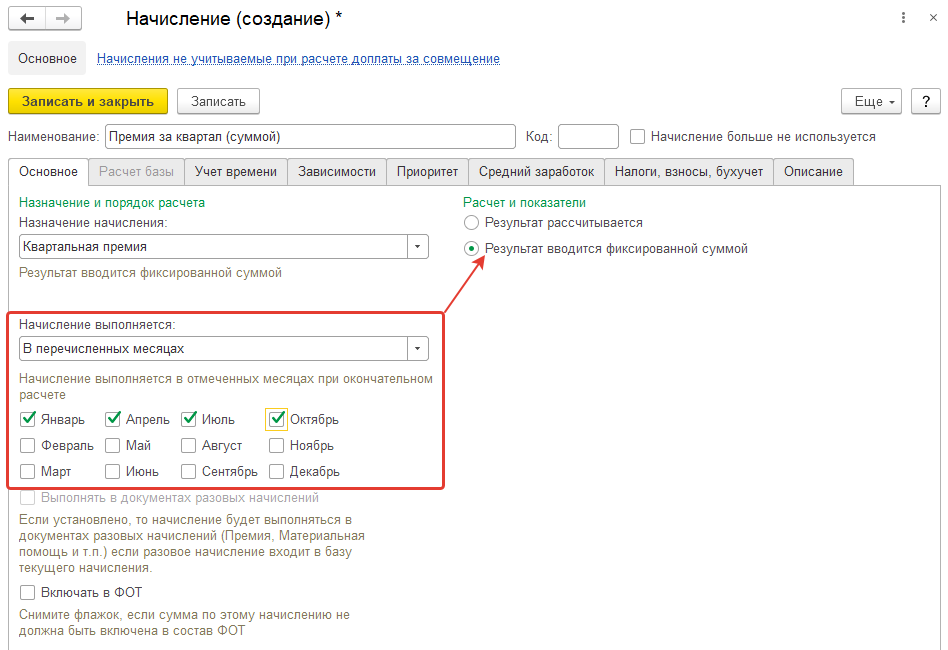 Пример. Секретарю организации по трудовому договору полагается квартальная премия фиксированной суммой. Размер ее постоянный, начисляется она в известные месяцы, сотрудник может быть лишен данной премии за какую-либо провинность. Возможно, такую премии удобно настроить на выполнение в перечисленных месяцах.