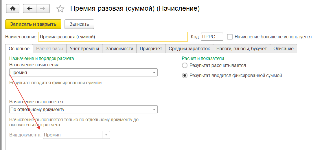 Это означает, что начисление будет задано и сразу рассчитано сотруднику отдельным документом "Премии".