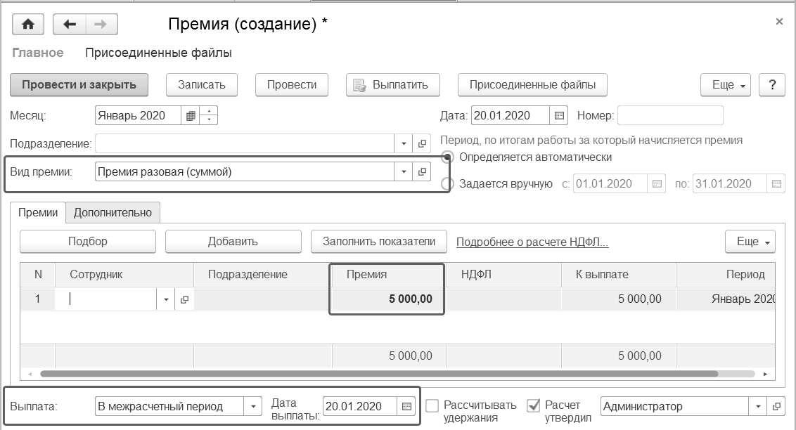 Пример. Добавленная выше премия к юбилею (или любая разовая премия) будет начисляться в день юбилея и выдаваться сразу сотруднику. Следовательно, ее целесообразно настроить по отдельному межрасчетному документу.