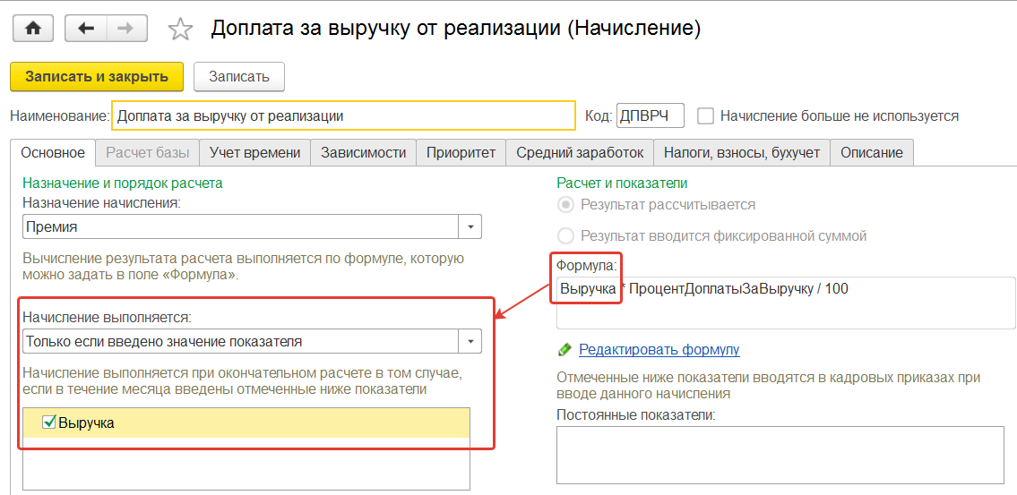 Тогда начисление можно настроить таким образом, чтобы оно было рассчитано при окончательном расчете зарплаты в документе "Начисление зарплаты и взносов" в том случае, если по сотруднику зарегистрирован размер выручки.
