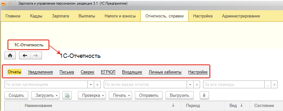 В текущей версии программы для формирования регламентированной отчетности в ИФНС и фонды удобно пользоваться специальной формой 1С-Отчетность. Она предназначена для подготовки отчетов и передачи их внешним пользователям отчетности.