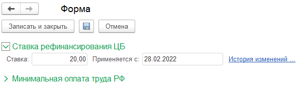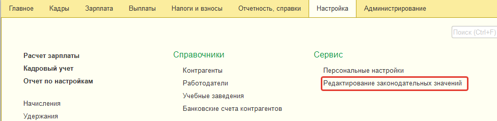 Обычно данные сведения обновляются в соответствии с изменениями законодательства при обновлении программы. Однако в случае проблем и задержек с обновлением их можно просмотреть и отредактировать вручную в разделе "Настройка / Редактирование законодательных значений".