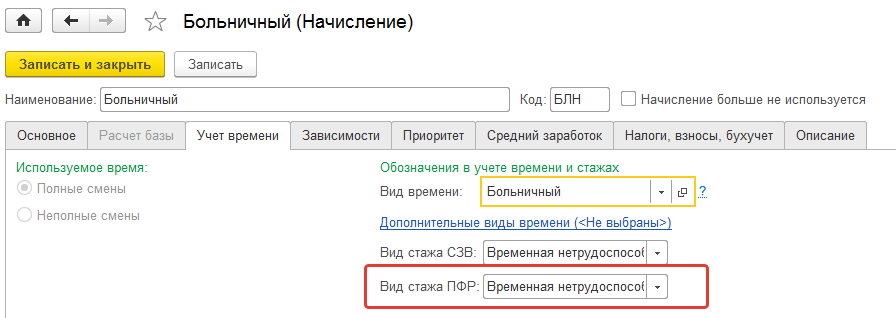 Для ПФР помимо сведений о доходах и взносах также подаются сведения о стаже работы сотрудников для целей исчисления пенсии в будущем. На формирование сведений о стаже влияют настройки мест работы сотрудников (особенности организаций, подразделений и должностей – см. выше) а также особенности настройки начислений за отработанное либо неотработанное время (реквизит – вид стажа в ПФР).