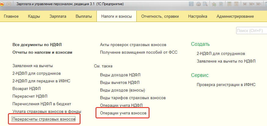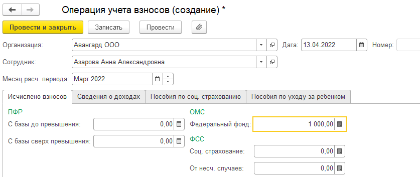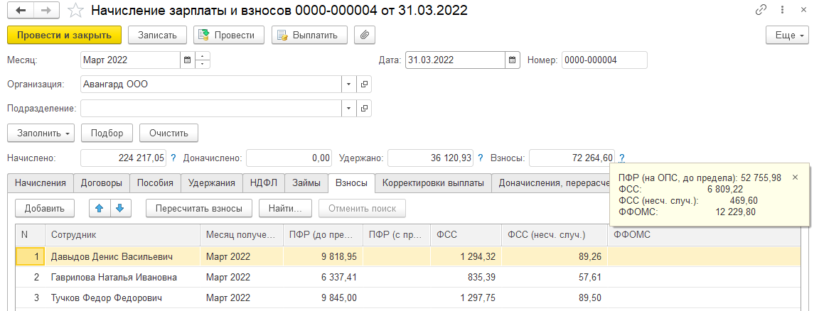 Окончательный расчет взносов с учетом данных по всем введенным за месяц документам производится в документе "Начисление зарплаты и взносов", а также в документе "Увольнение" при увольнении сотрудника и при необходимости в документах по незарплатным доходам.