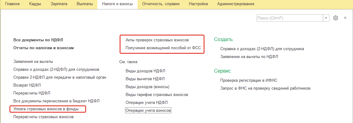 С 2017г. сведения об уплате страховых взносов в зарплатную программу не вносятся. Исключение составляют взносы в ФСС (по временной нетрудоспособности и по несчастным случаям). Для регистрации сумм уплаченных страховых взносов к отчетности используется документ "Уплата страховых взносов в фонды". Он вызывается в разделе "Налоги и взносы".