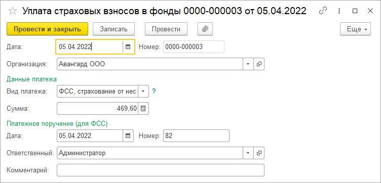 Документ создается отдельно на каждый вид платежа. Дата документа – это дата уплаты, также в документе указывается сумма уплаченных взносов и реквизиты документа.
