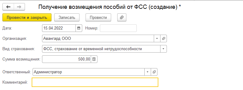 Также для регистрации взаиморасчетов с ФСС может использоваться документ "Получение возмещение пособий ФСС" (раздел "Налоги и взносы"). Он создается в том случае, если ФСС возмещает организации расходы по больничным и другим пособиям. В документе указывается вид страхования, дата и сумма возмещения.