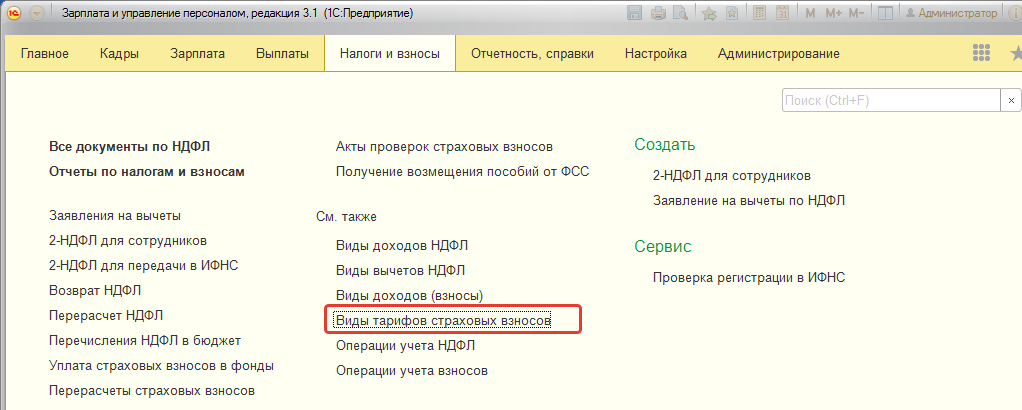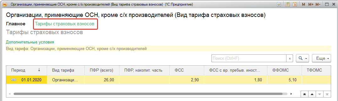 Виды тарифов страховых взносов, выбираемые для организации, можно просмотреть в одноименном справочнике в разделе "Налоги и взносы/ Виды тарифов страховых взносов".