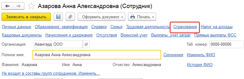При этом застрахованные лица могут иметь различный статус для целей исчисления взносов. Эти сведения, а также сведения об инвалидности настраиваются в карточке сотрудника/физического лица по ссылке "Страхование".