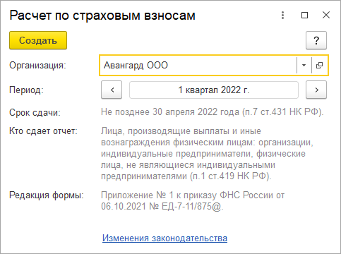 Сформируем отчет "Расчет по страховым взносам" для ООО "Авангард" за 1 квартал 2022г. Для этого перейдем в раздел отчетов формы 1С-Отчетность. Нажмем команду "Создать". Из папки "Налоговая отчетность" выберем форму отчета двойным кликом левой клавиши мыши.