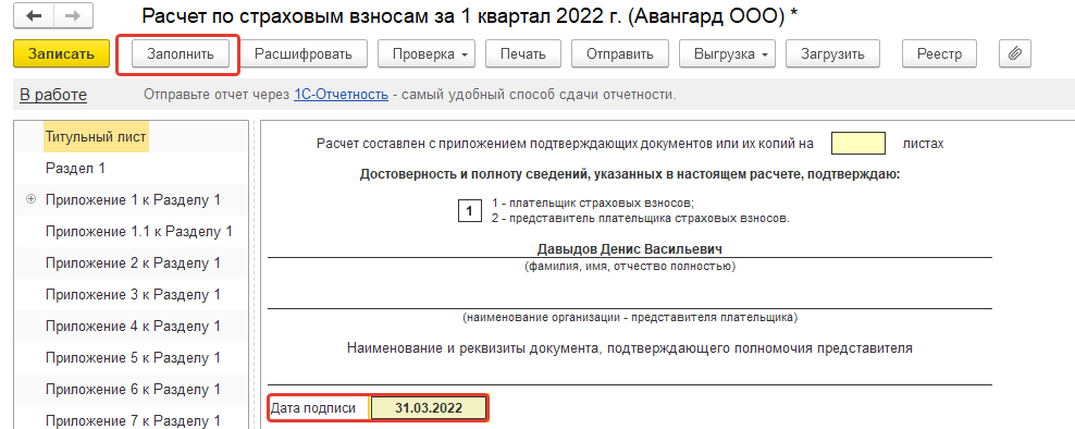 В созданной форме отчета укажем дату отчета – 31.03.2022 и нажмем команду "Заполнить".
