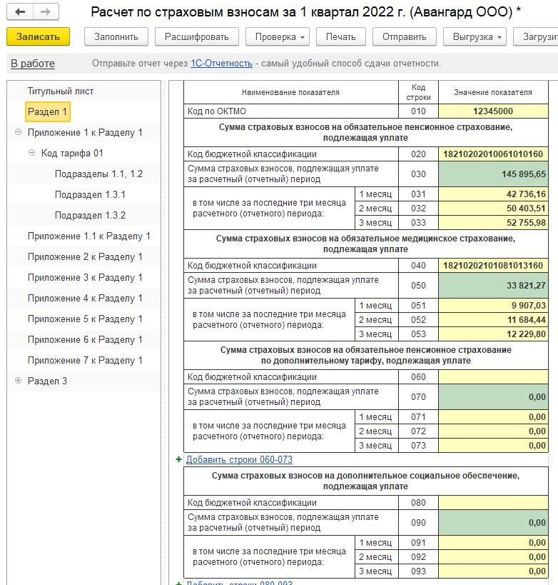 Регламентированная отчетность по страховым взносам, так же, как и отчетность по НДФЛ, может формироваться с помощью специализированного инструмента из раздела "Отчетность, справки": 1С-Отчетность.