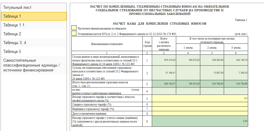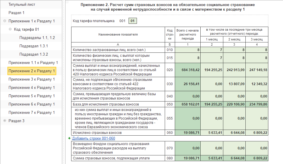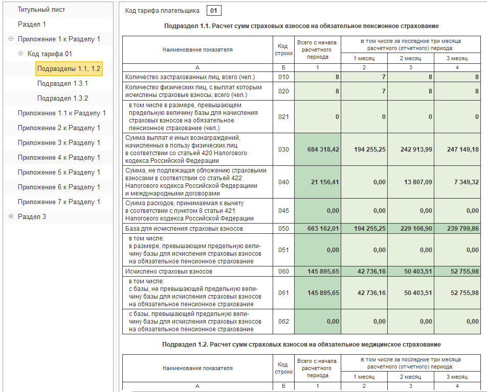 Приложение 1 к разделу 1 заполняется отдельно по каждому применяемому коду тарифа для взносов в ПФР и ФСС.