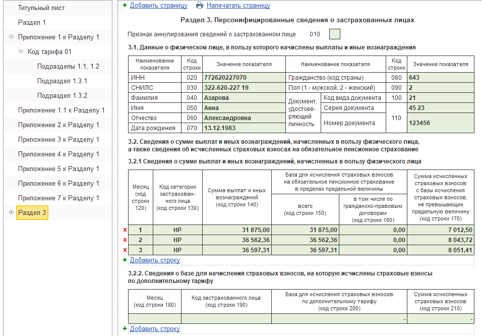 В разделе 3 формируется отдельная страничка для каждого физического лица, который получал доходы в данной организации с личными данными и сведениями о начислении взносов на обязательное пенсионное страхование.