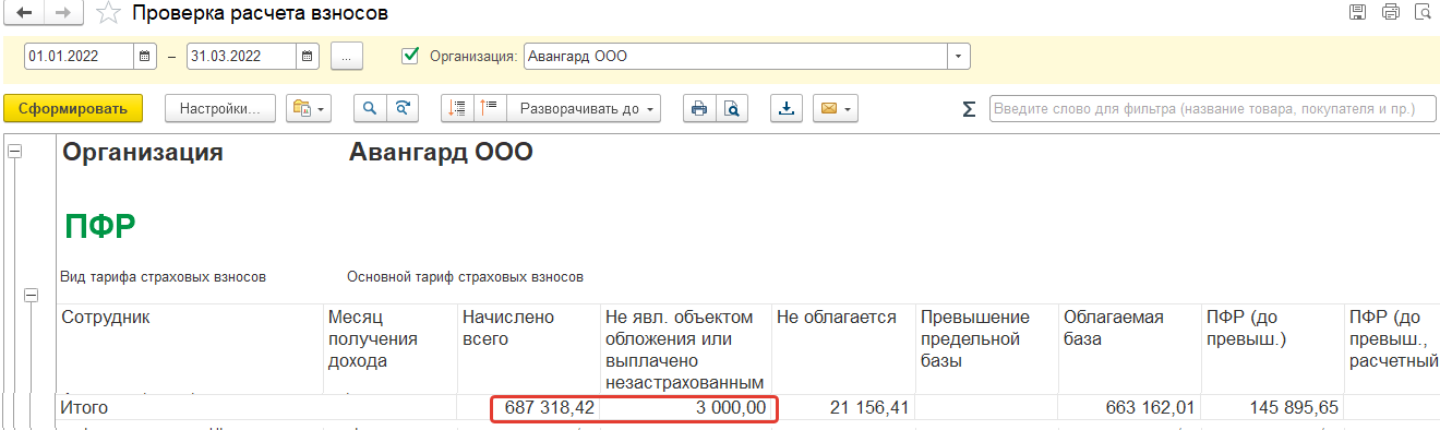 Убедимся по отчетам, что все суммы в РСВ верны. Напомним сумму доходов, отраженную в бухучете, которую мы вычисляли по своду при проверке НДФЛ: сумма начисленных доходов и доходов в натуральной форме за 1 квартал равна 687 318,42 руб. При этом доход в виде подарка на сумму 3 тыс. руб. не является объектом обложения страховыми взносами и не должен попадать в РВС. Дивиденды также не отражаются в РСВ. Сформируем отчет Проверка расчета взносов и убедимся в верности указанных сумм в учете страховых взносов.
