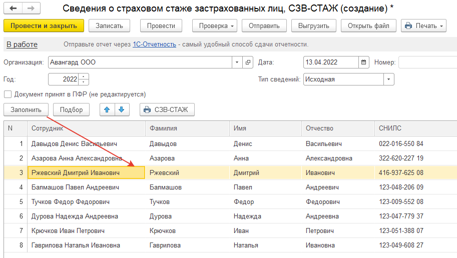 При создании нового документа указывается организация и год, за который предоставляется отчет, тип формы (исходная/корректирующая/отменяющая). Документ заполняется по одноименной команде списком сотрудников, для которых необходимо заполнить сведения о стаже.