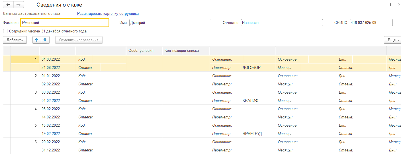 Документ готов для передачи в ПФР. Двойным кликом мыши откроем нескольких сотрудников и убедимся, что все неявки в периоды стажа включены (пример для Ржевского).