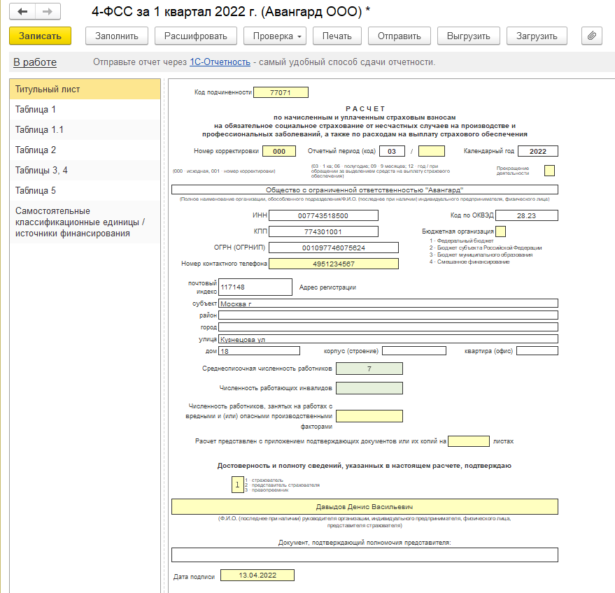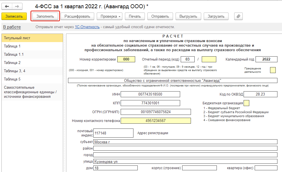 Для заполнения созданного отчета нажмем кнопку "Заполнить". Отчет состоит из титульного листа и нескольких таблиц, которые заполняются при наличии соответствующих сведений в программе.
