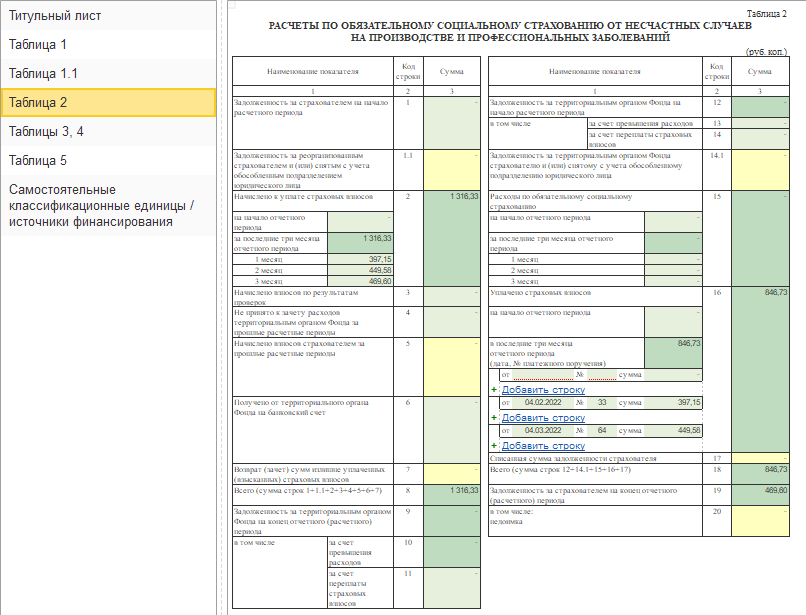 В таблице 2 отражаются взаиморасчеты по взносам на травматизм: начислено, потрачено на выдачу пособий, уплачено.