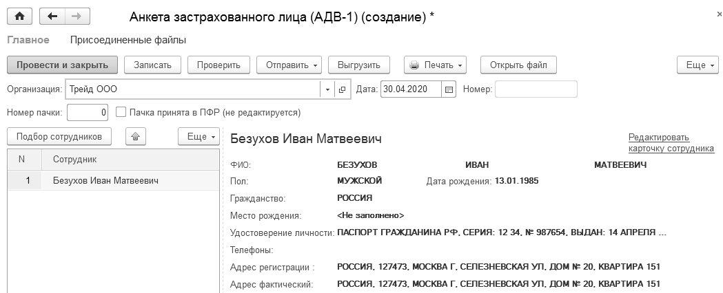 Для формирования пачек анкет АДВ-1 используется документ "Пачка документов АДВ-1". Анкета создается на сотрудников, которые еще ни разу не получали страховое свидетельство пенсионного страхования, т.е. это сотрудники, у которых еще нет страховых номеров ПФР. Анкета может составляться как на одного, так и на нескольких сотрудников. По команде "Подбор" в документ подбираются те сотрудники, у которых нет страховых номеров в ПФР (СНИЛС).