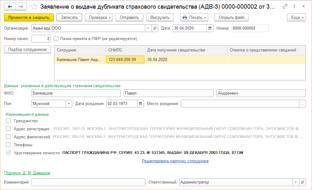 При выборе сотрудников заполняются их личные данные, если данные были введены корректно, то документ готов к отправке.