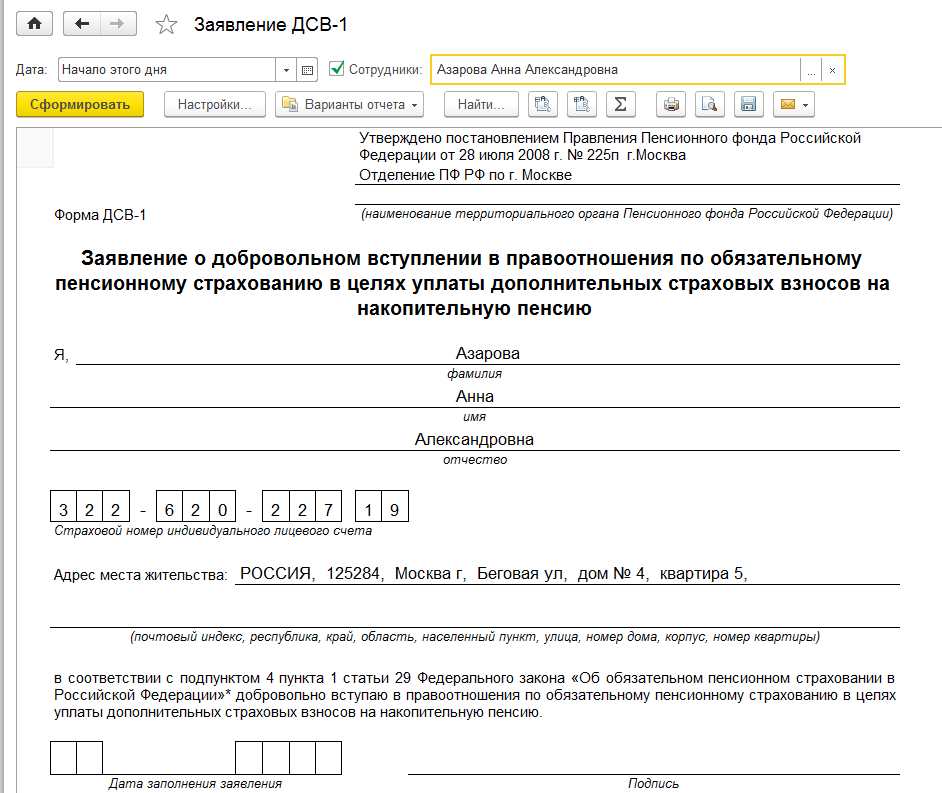 В первом случае заявление достаточно принять, проверить и отправить сведения в отделение ПФР. Во втором случае сотрудник отдела кадров может составить печатную форму заявления с помощью отчета "Заявление ДСВ-1". Отчет доступен в разделе " Налоги и взносы / Отчеты по налогам и взносам".
