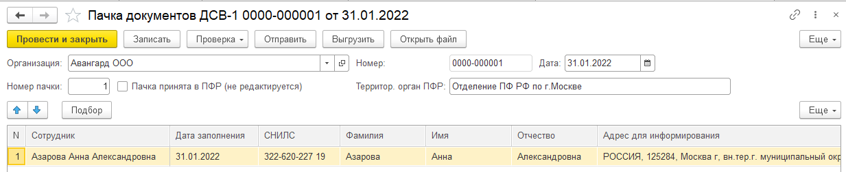 В отчете выбирается сотрудник, требуемая форма формируется автоматически. После получения подписанного заявления сотрудника организация обязана передать его в ПФР также в электронном виде. Для этого предназначен документ "Пачки документов ДСВ-1". При создании документа указывается организация, ответственное лицо, а также наименование органа ПФР, куда подается заявление. В документе подбираются физические лица, подавшие заявления ДСВ-1, их личные данные заполняются автоматически.