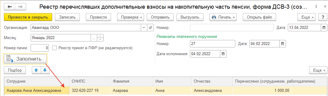 Удержанные у сотрудников суммы перечисляются отдельным платежным поручением. Ежеквартально для отчетности составляется реестр застрахованных лиц на каждое платежное поручение, которым перечисляются дополнительные взносы, удержанные из зарплаты сотрудников по их заявлениям, и/или взносы работодателя на накопительную часть трудовой пенсии своих сотрудников. Составленные реестры ежеквартально представляются в территориальные органы Пенсионного фонда РФ. Для этих целей используется документ "Реестр ДСВ-3"