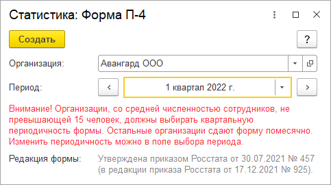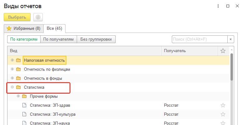 С помощью инструмента 1С-Отчетность (или инструмента подготовки регламентированных отчетов) можно сформировать отчетные формы для органов статистики. Данные отчеты выбираются по команде "Создать" из папки "Статистика".