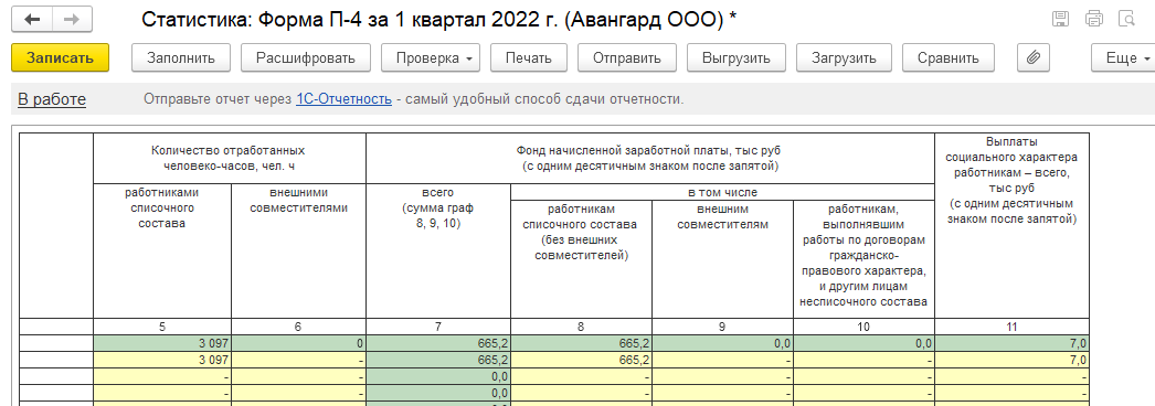 Отчеты по форме П-4, ЗП, П-4 (НЗ) заполняются по кнопке "Заполнить" и могут быть скорректированы вручную.