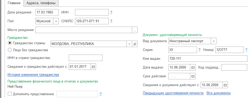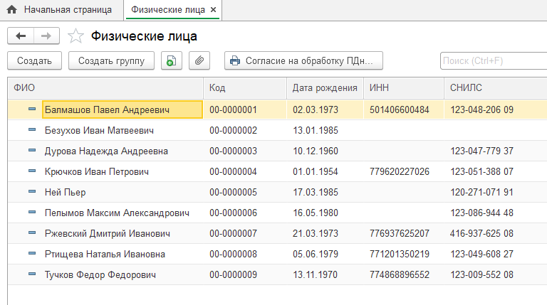 4. Справочник "Физические лица" заполнен следующими элементами: