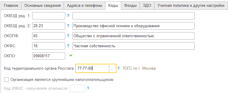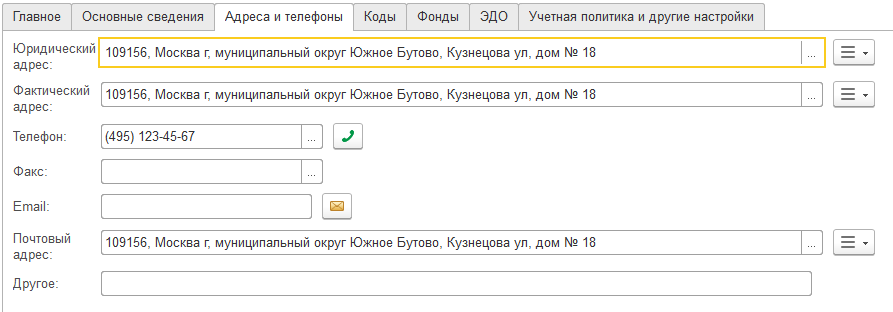 5. В справочнике "Организации" добавлена организация – ООО "Авангард". Ниже указаны данные карточки организации:
